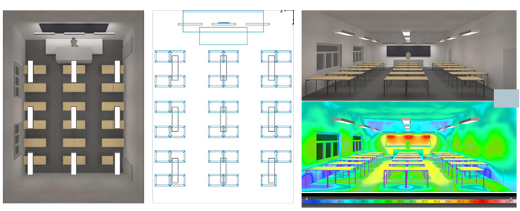 通過專業的軟件,我們做出來一套非常完整的(de)布燈圖,這些布燈圖都是根據(jù)我司專用的LED護眼專用教室燈的產品才能達到如圖的效果
